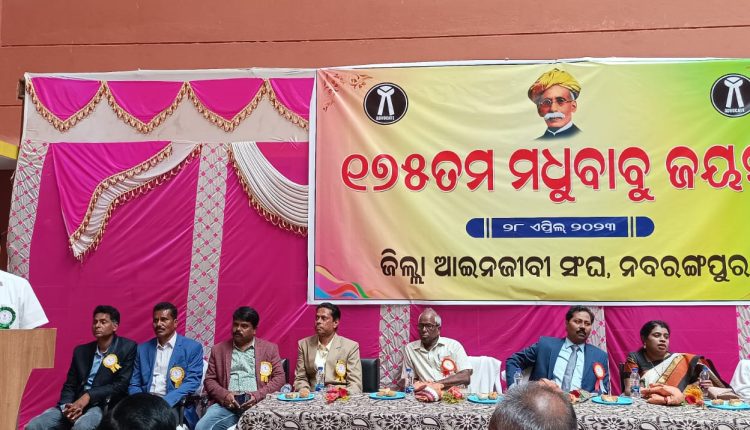 ନବରଙ୍ଗପୁର : ନବରଙ୍ଗପୁର ଜିଲ୍ଲା ଓକିଲ ସଂଘ ପକ୍ଷରୁ ଉତ୍କଳ ଗୌରବ ମଧୁସୂଦନ ଦାଶଙ୍କ ୧୭୫ ତମ ଜୟନ୍ତୀ ତଥା ଆଇନଜୀବୀ ଦିବସ ପାଳିତ ହୋଇଯାଇଛି । ପୂର୍ବାହ୍ନରେ ସ୍ଥାନୀୟ ମଧୁବାବୁ ପାର୍କ ସ୍ଥିତ ମଧୁବାବୁଙ୍କ ପ୍ରତିମୂର୍ତିରେ ଆଇନଜୀବୀ ମାନେ ମାଲ୍ୟାର୍ପଣ କରିଥିଲେ। ଜିଲ୍ଲା ଦୌରା ଜଜ ଅଦାଲତ ପରିସରରେ ଅନୁଷ୍ଠିତ ଆଇନଜୀବୀ ଦିବସ ପାଳନ କାର୍ଯ୍ୟକ୍ରମରେ ମୁଖ୍ୟ ଅତିଥି ଭାବେ ନିର୍ଦ୍ଦେଶକ ଅଭିଯୋଜନ ଲୋକାୟୁକ୍ତ ଓଡିଶା ଯୋଗ ଦେଇଥିବାବେଳେ ମୁଖ୍ୟ ବକ୍ତା ଭାବେ ଜଯପୁର ଆଇନ ମହାବିଦ୍ୟାଳୟର ଅଧକ୍ଷ ଚିନ୍ତାମଣି ପଣ୍ଡା, ସମ୍ମାନିତ ଅତିଥି ଭାବେ ଭାରପ୍ରାପ୍ତ ଜିଲ୍ଲା ଜଜ ତଥା ଏଡିଜେ ପ୍ରଣତୀ ସାହା, ଏଡିଜେ ଶିବ ପ୍ରସାଦ ମିଶ୍ର ଓ ନବରଙ୍ଗପୁର ଜିଲ୍ଲାପାଳ ଡ କମଳ ଲୋଚନ ମିଶ୍ର ଯୋଗ ଦେଇଥିଲେ । ଅନ୍ୟତମ ଅତିଥି ଭାବେ ଜିଲ୍ଲା ଆଇନ ସେବା ପ୍ରାଧିକରଣ ସମ୍ପାଦକ ଜନକ ରାଉତ, ରେଜିଷ୍ଟାର ସୁଶାନ୍ତ କୁମାର ଜେନା ଏବଂ ଜେ ଏମ ଏଫ ସି ଆର୍ଯ୍ୟବାଳା ତ୍ରିପାଠୀ ଯୋଗ ଦେଇଥିଲେ । ଉପ ସଭାପତି ଅତିଥି ମାନଙ୍କୁ ମଞ୍ଚକୁ ସ୍ଵାଗତ କରିଥିବାବେଳେ ମହିଳା ଆଇନଜୀବୀ ମାନେ ପୁଷ୍ପଗୁଚ୍ଛ ଦେଇ ସ୍ଵାଗତ ସମ୍ବର୍ଦ୍ଧନା କରିଥିଲେ । ଯୁଗଳ ମ୍ୟୁଜିକ ଗ୍ରୁପ ଦ୍ଵାରା ବନ୍ଦେ ଉତ୍କଳ ଜନନୀ ସଙ୍ଗୀତ ପରିବେଷଣ କରାଯାଇଥିଲା । ଅତିଥିମାନେ ମଧୁବାବୁଙ୍କ ପ୍ରତିଛବିରେ ପୁଷ୍ପ ମାଲ୍ୟାର୍ପଣ କରିବା ସହ ପ୍ରଦ୍ଵୀପ ପ୍ରଜ୍ଵଳନ କରିଥିଲେ । ସଂଘର ସଭାପତି ନରସିଂହ ତ୍ରିପାଠୀ ଅଧ୍ୟକ୍ଷତା କରିଥିଲେ । ସମ୍ପାଦକ ତପନ ସିଂ ସମ୍ପାଦକିୟ ବିବରଣୀ ପାଠ କରିଥିଲେ । ସଂଘର ୧୦ ଜଣ ବରିଷ୍ଠ ଆଇନଜୀବୀ ଉମାଶଙ୍କର ତ୍ରିପାଠୀ , ସଦନ ନାୟକ , ଝାଡେଶ୍ଵର ଖାଡାଙ୍ଗା, ଶ୍ୟାମ ପ୍ରସାଦ ଗନ୍ତାୟତ , ସୂର୍ଯ୍ୟ ନାରାୟଣ ତ୍ରିପାଠୀ ,ସି ଏଚ ବାବା ଯୁଗନ୍ଧର, କେ ଜି ପଟ୍ଟନାୟକ , ଦିଲ୍ଲୀପ ବେହେରା , ସୁଧାକର ପଟ୍ଟନାୟକ , ସୁରେଶ ନାୟକଙ୍କୁ ସଂଘ ପକ୍ଷରୁ ଅତିଥିମାନେ ସମ୍ବର୍ଦ୍ଧନା କରିଥିଲେ । ମୁଖ୍ୟ ଅତିଥି ତାଙ୍କ ବକ୍ତବ୍ୟରେ ଆଇନଜୀବୀ ମାନଙ୍କୁ ନିଜ ପେଷା ସହ ସମାଜସେବା କାର୍ଯ୍ୟ କରିବାକୁ ଆଗଭର ହେବା ଉଚିତ ବୋଲି ପରାମର୍ଶ ଦେଇଥିଲେ । ମୁଖ୍ୟବକ୍ତା ମଧୁବାବୁଙ୍କ ସ୍ମୃତିଚାରଣ କରିବା ସହ ଆଇନଜୀବୀମାନେ ମଧୁବାବୁଙ୍କ ଆଦର୍ଶରେ ଅନୁପ୍ରାଣିତ ହେବାକୁ କହିଥିଲେ । ଏଡିଜେ ପ୍ରଣତୀ ସାହା ଆଇନଜୀବୀମାନଙ୍କ ଉପରେ ମହକିଲ ମାନଙ୍କ ପ୍ରଘାଢ ବିଶ୍ବାସ ରହିଥାଏ । ଆଇନଜୀବୀ ମାନଙ୍କୁ ସମାଜର ଟର୍ଚ ବିଅରର ବୋଲି ଅଭିହିତ କରିଥିଲେ । ଏଡିଜେ ଶିବ ପ୍ରସାଦ ମିଶ୍ର ତାଙ୍କ ବକ୍ତବ୍ୟରେ କାହାଣୀ ମାଧ୍ୟମରେ ଉଦାହରଣ ଦେଇ ଆଇନଜୀବୀ ମାନେ ସମାଜର ଅସାଧାରଣ ବ୍ୟକ୍ତିତ୍ବ ଅଟନ୍ତି ବୋଲି କହିଥିଲେ । ନବରଙ୍ଗପୁର ଜିଲ୍ଲାପାଳ ଡ ମିଶ୍ର ତାଙ୍କ ବକ୍ତବ୍ୟରେ ସମାଜର ନିଷ୍ପେସିତ ବର୍ଗର ବ୍ୟକ୍ତି ବିଶେଷ ମାନଙ୍କ ଏବଂ ମହିଳା ମାନଙ୍କ ଅଧିକାର ସୁରକ୍ଷା ପାଇଁ ସାହାଯ୍ୟର ହାତ ବଢେଇବା ପାଇଁ ଆହ୍ଵାନ ଦେଇଥିଲେ । ଏହି ଅବସରରେ ଅତିଥି ମାନଙ୍କୁ ବରିଷ୍ଠ ଆଇନଜୀବୀ ଉମା ଶଙ୍କର ତ୍ରିପାଠୀ ଓ ବରିଷ୍ଠ ଆଇନଜୀବୀ ଝାଡେଶ୍ଵର ଖାଡାଙ୍ଗା ଉପ ଢୌକନ ଦେଇ ସମ୍ବର୍ଦ୍ଧିତ କରିଥିଲେ । ଏହି କାର୍ଯ୍ୟକ୍ରମରେ କୋଷାଧକ୍ଷ ଅନିଲ ଦୀନବନ୍ଧୁ ମଞ୍ଚାସୀନ ହୋଇଥିଲେ । ଶେଷରେ ଯୁଗ୍ମ ସମ୍ପାଦକ ସନ୍ଦୀପ ମିଶ୍ର ଧନ୍ୟବାଦ ଅର୍ପଣ କରିଥିଲେ । ଏଥିରେ କାର୍ଯ୍ୟକାରିଣୀ ସଦସ୍ୟ ପ୍ର